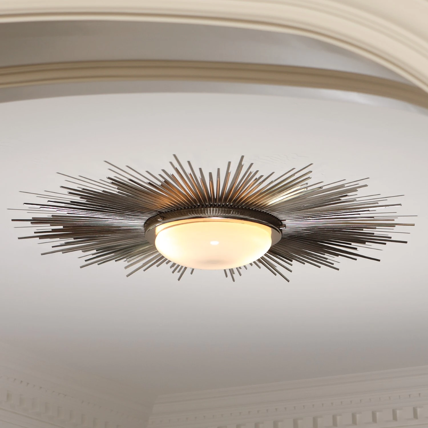 Bring a sunny burst of light to a room with our Sunburst Light Fixture! The fixture features a frosted glass shade and holds two 40 watt bulbs. Available in two metal finishes: nickel and gold.