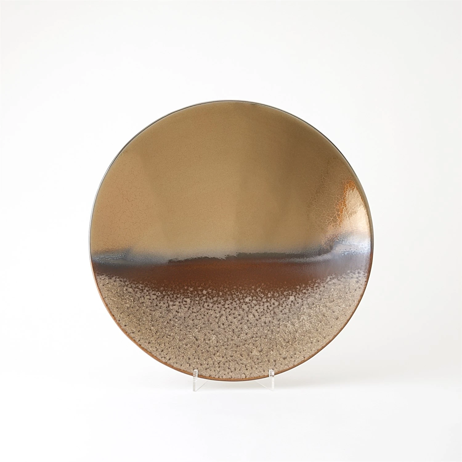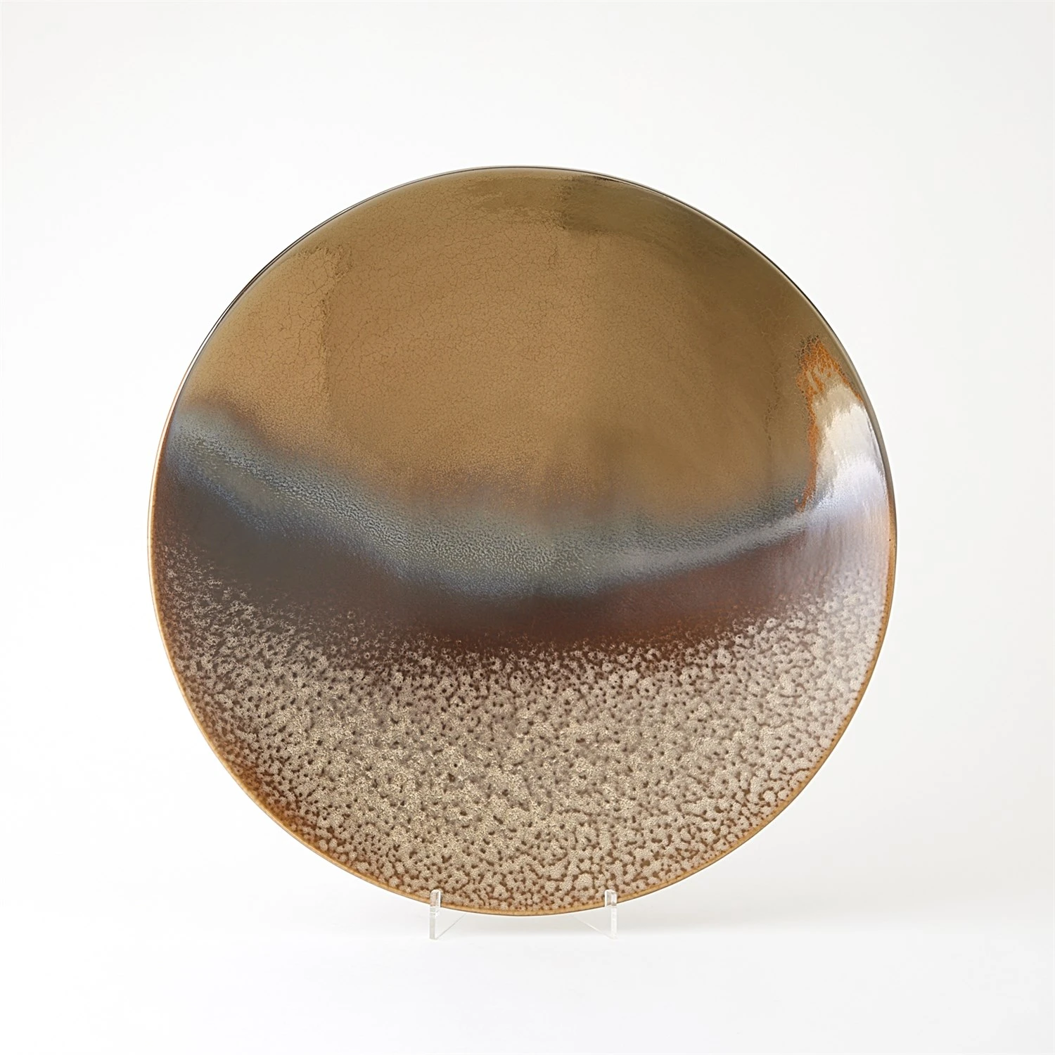 The Sunset Platters are a collection of one-of-a-kind pieces crafted from Portuguese slip-molded ceramic with a reactive glaze that captures the breathtaking beauty of a sunset. Plate stands sold separately.