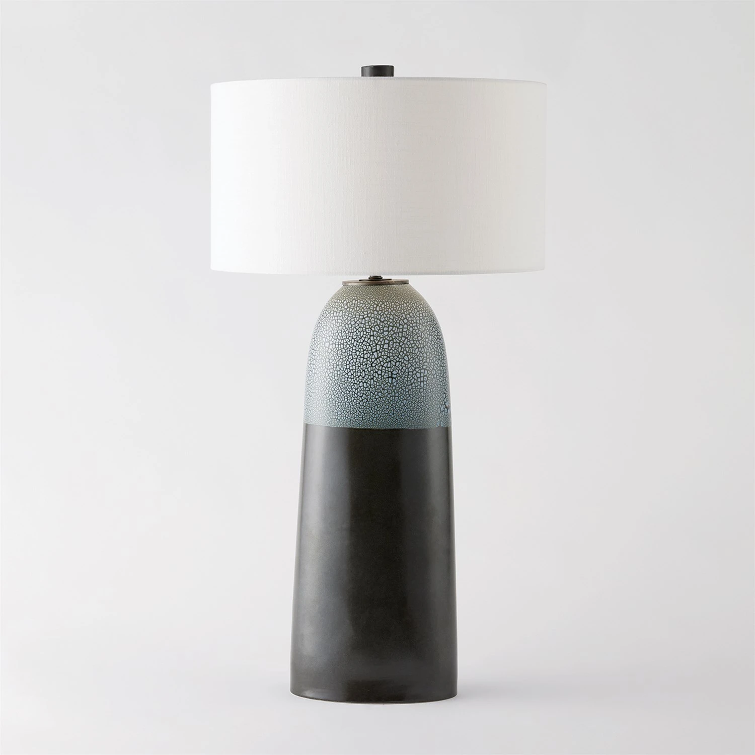 The Terra Lamp is constructed of Portuguese slip-cast ceramic and features a contrasting crackled finish on the top half of the piece. Includes a hardback fabric shade.
