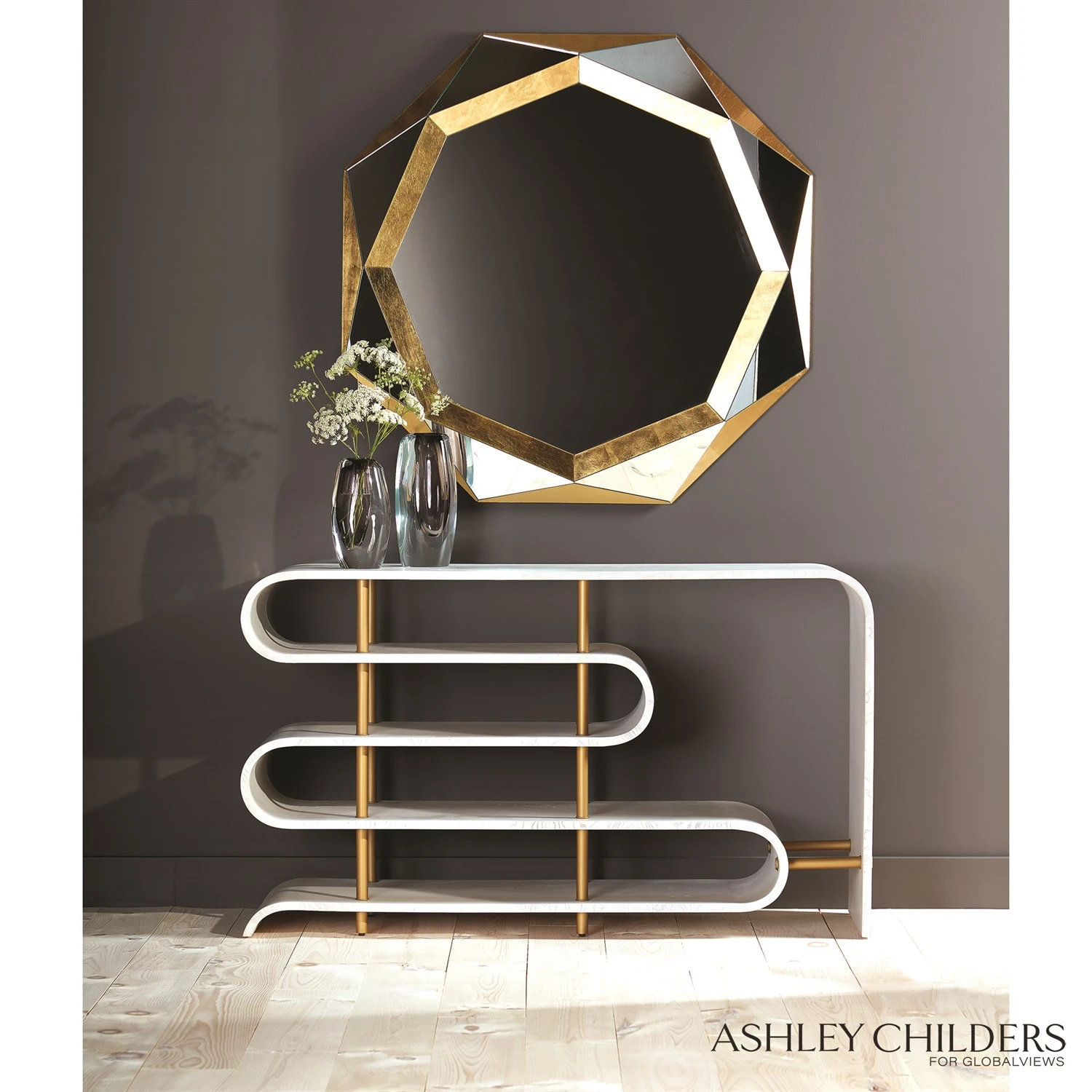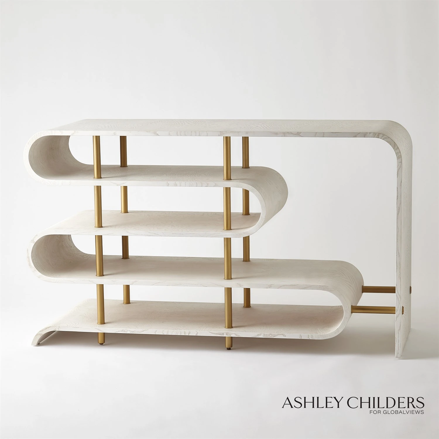 Fluid, curving lines found in nature inspired our Traverse Console. A combination of exquisite form mixed with expertly matched veneers, our signature white stained finish and gleaming satin brass accents make this design a true original.