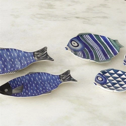 Fish as blue as the Mediterranean Sea. These fish are richly glazed in shades of blue with black and white accents. These can be used as wall decor or the perfect serving platters for a gathering. Use individually or as a set. Each sold separately.