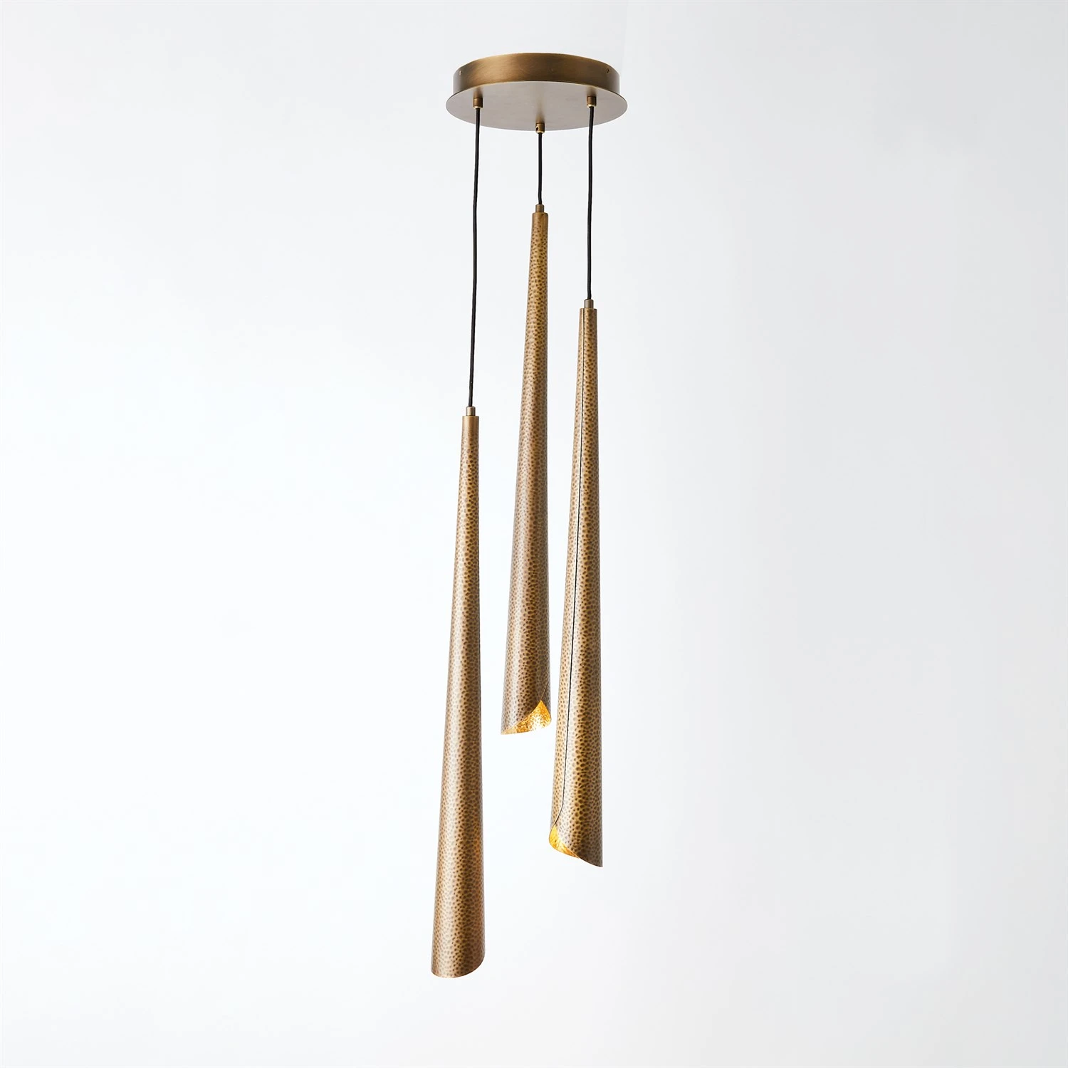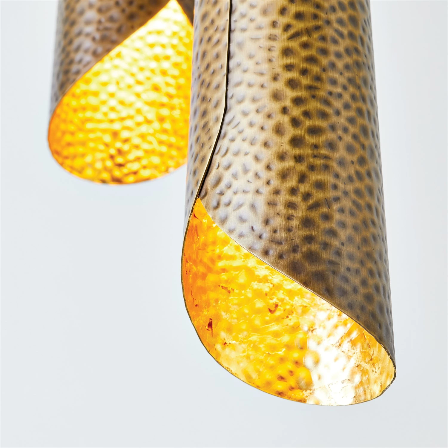Formed of sheet brass and finished with a hammered texture and antiquing the wrapped body of the Trumpet chandelier and pendant is illuminated by a single LED light source. The gold leafed interior reflects a warm glow for both ambient and single spot lighting.