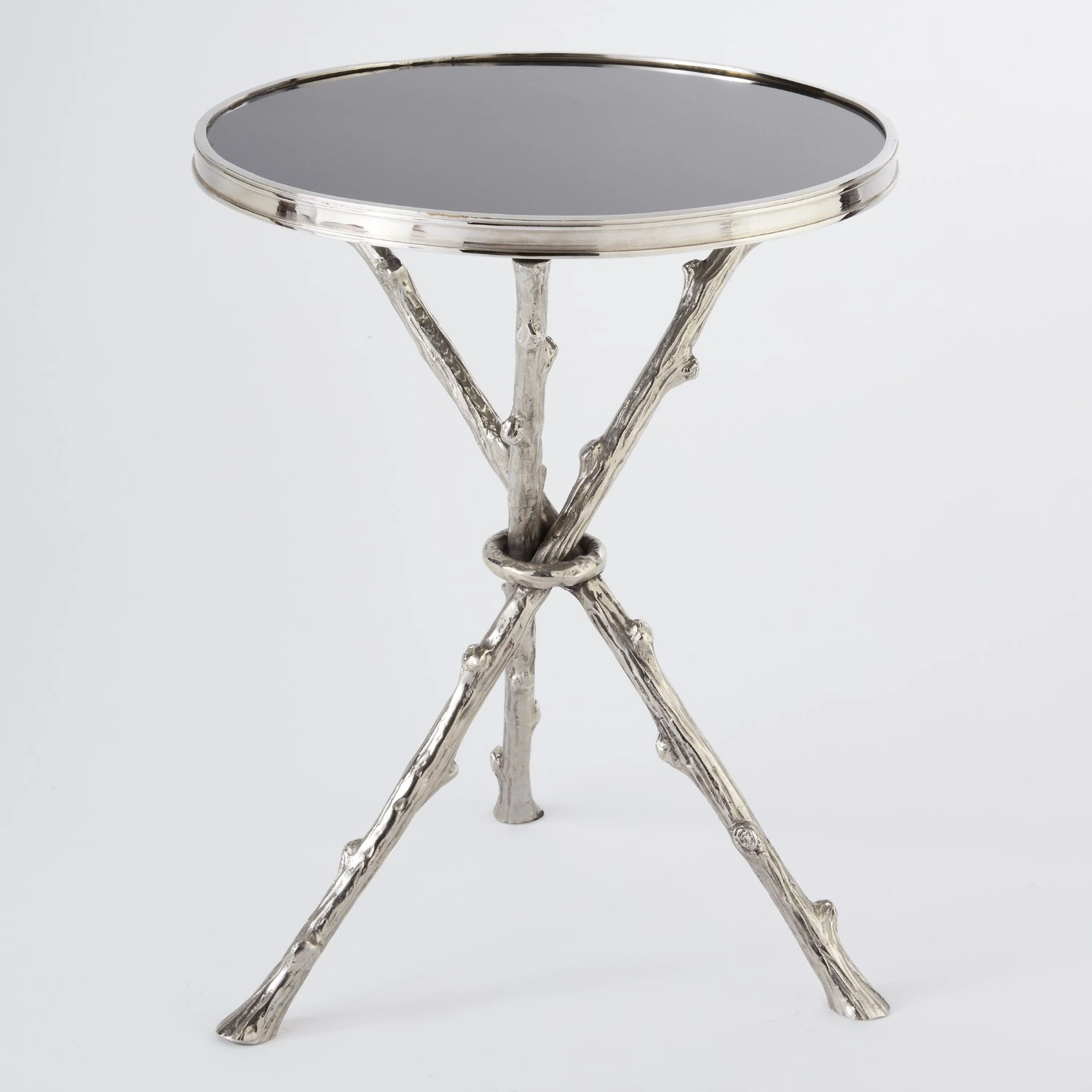 Referencing the natural world, this beautiful table has a twig textured nickel frame and is topped with a round black granite surface. The simple beauty of the materials shines through in this timeless design.