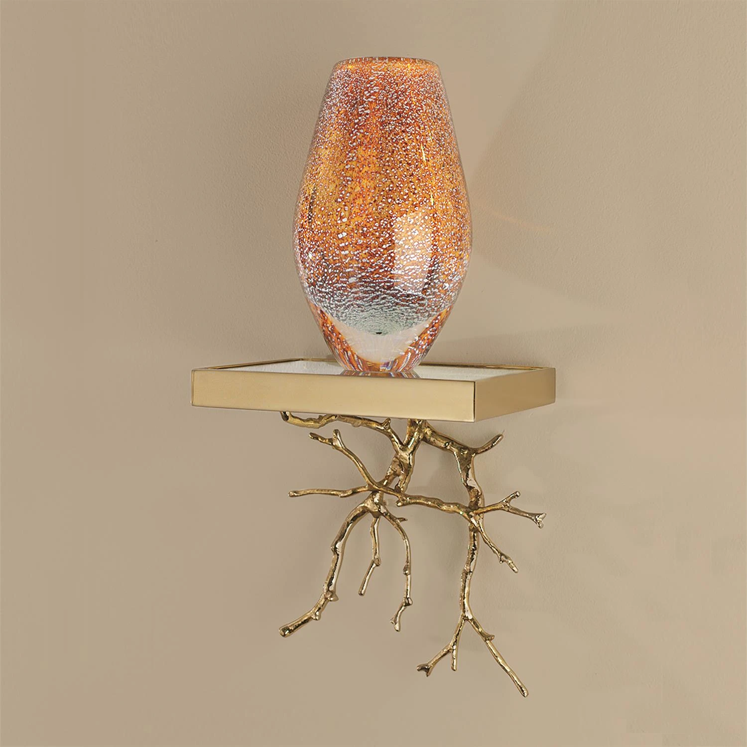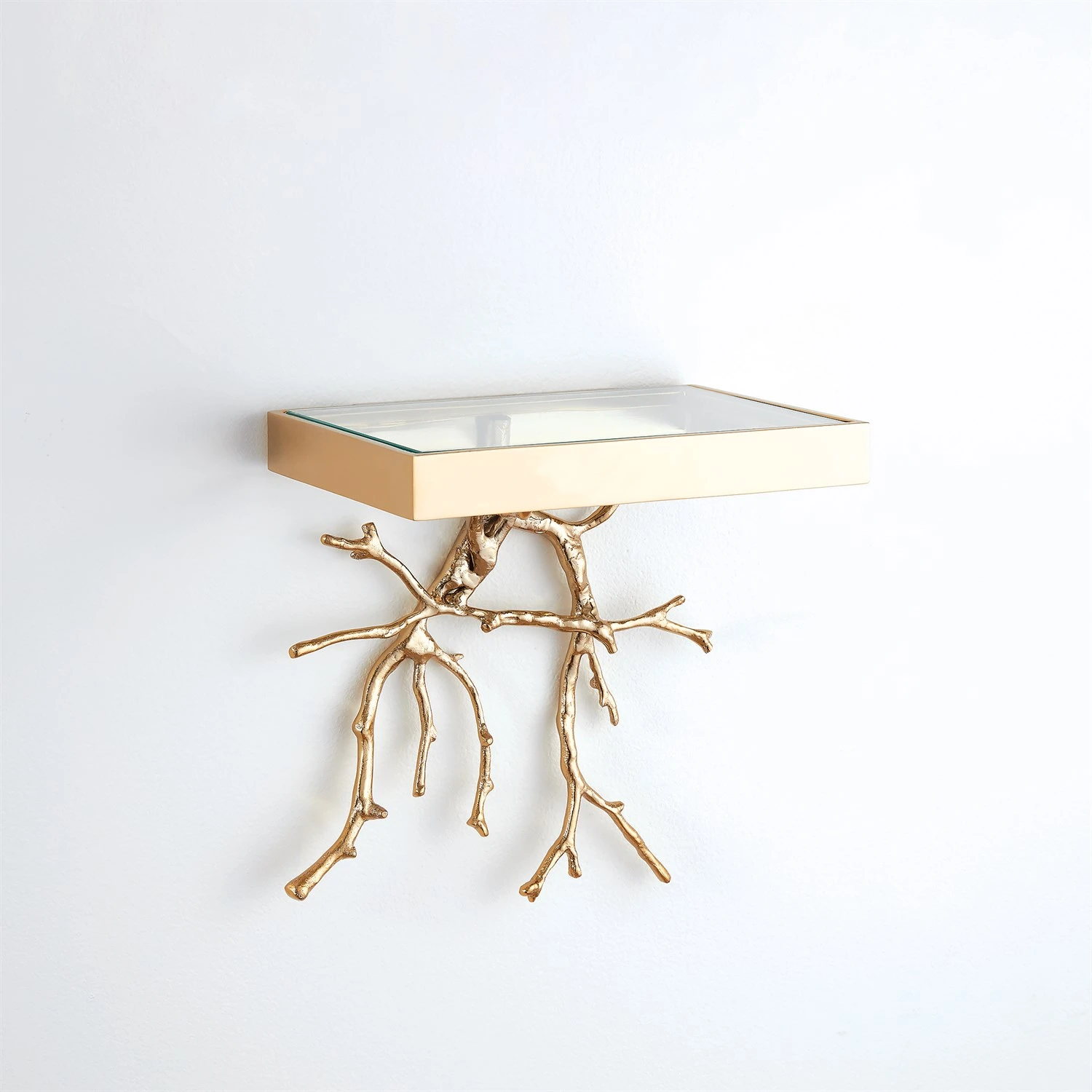 The twig wall bracket is solid sand cast brass that is painstakingly hand polished. It hangs on a solid brass cleat. The glass shelf of the bracket is the perfect place to showcase any treasure.