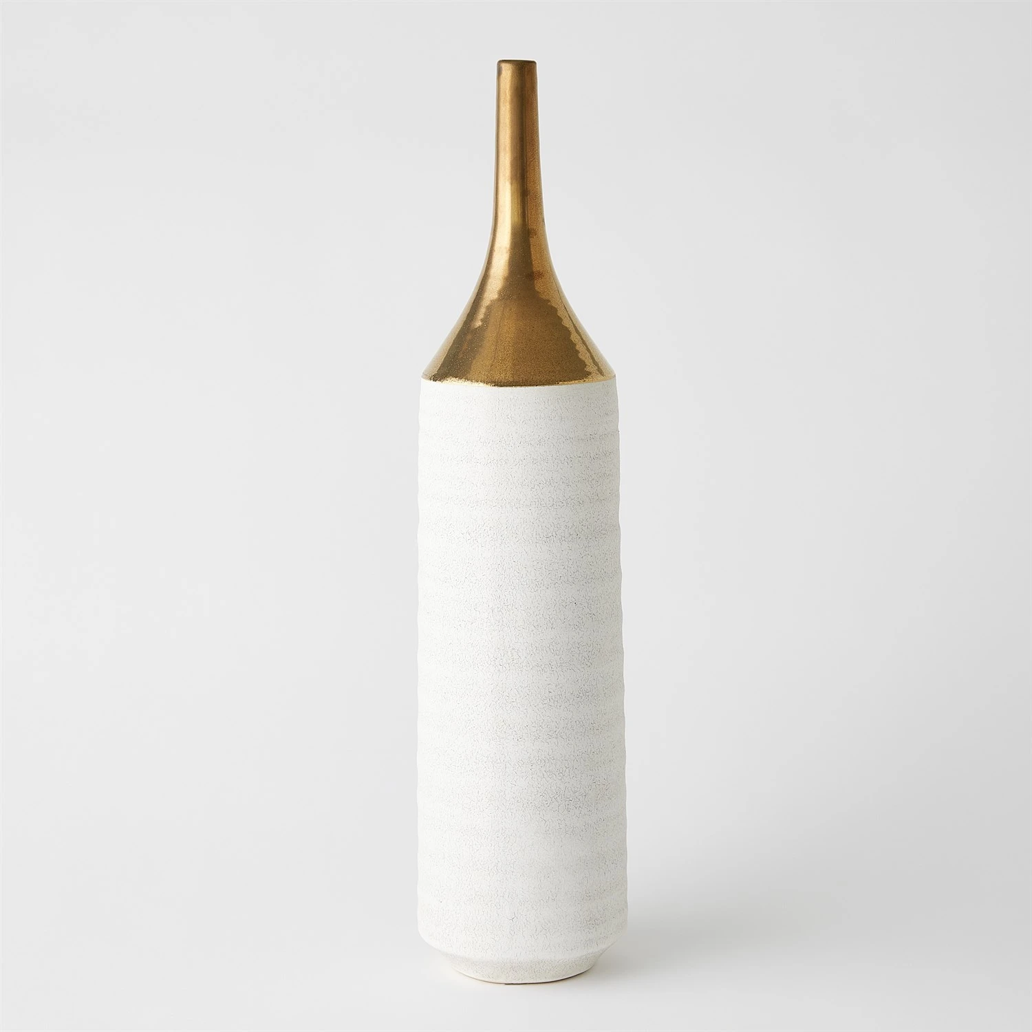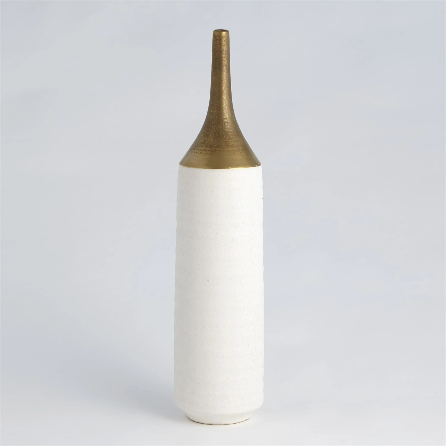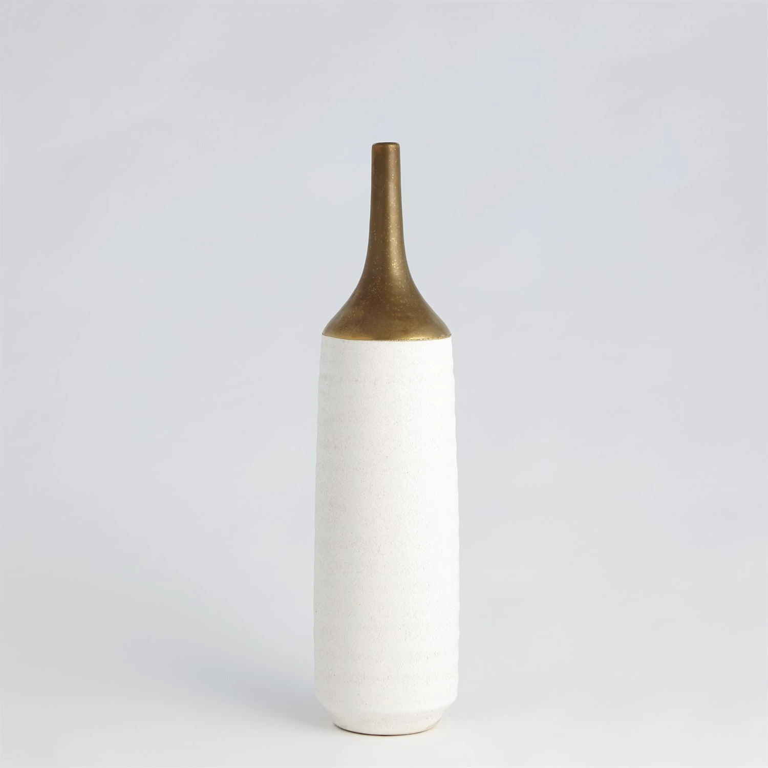 Our Two-Toned Vase is a slip-molded ceramic with a long, antiqued electroplated gold neck. A textured white glaze covers the remainder of the body.