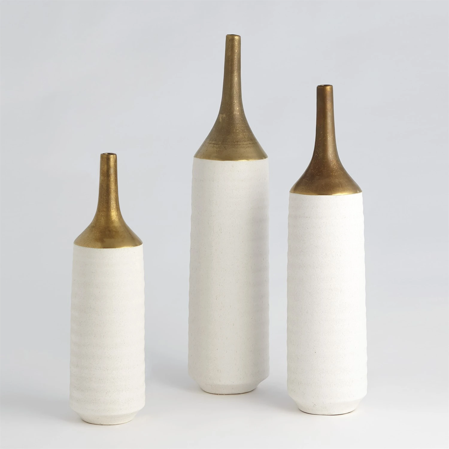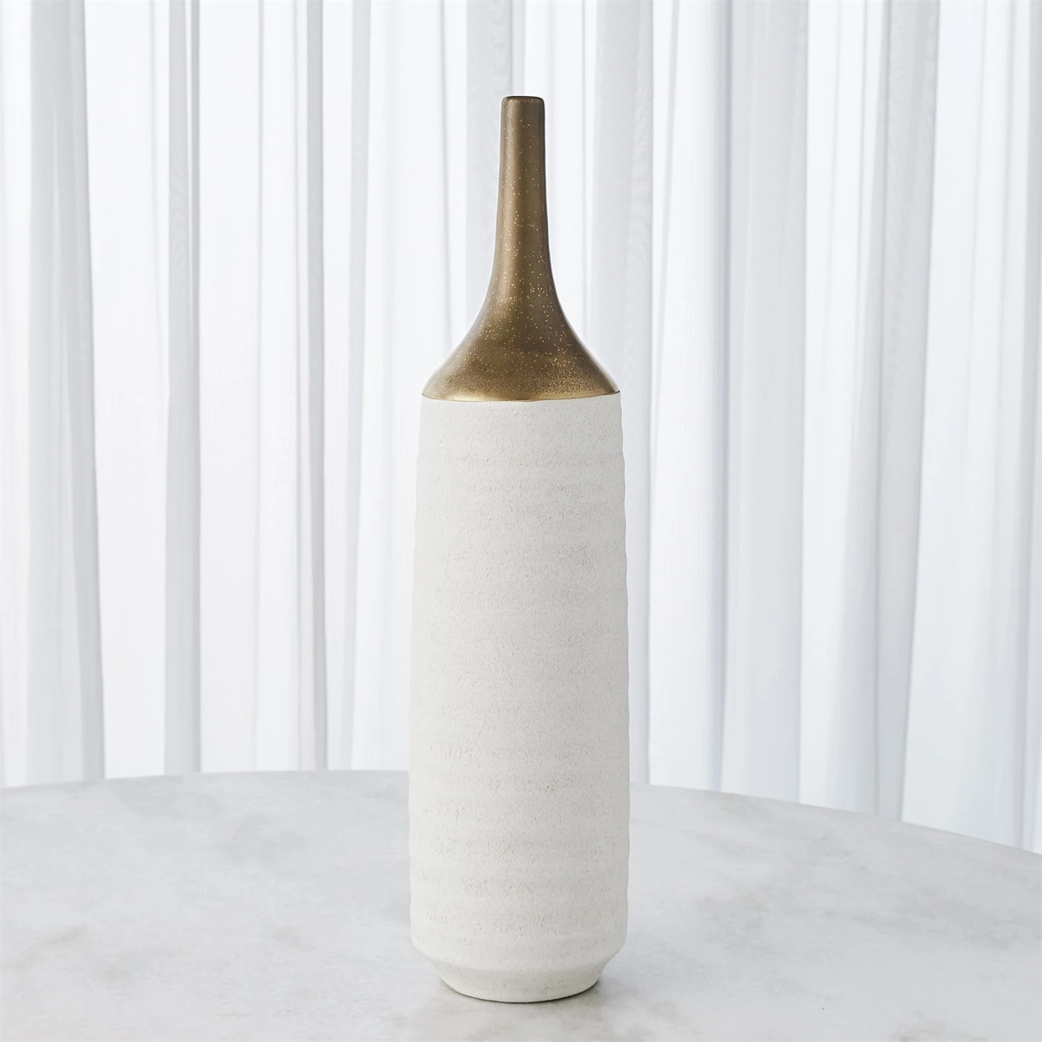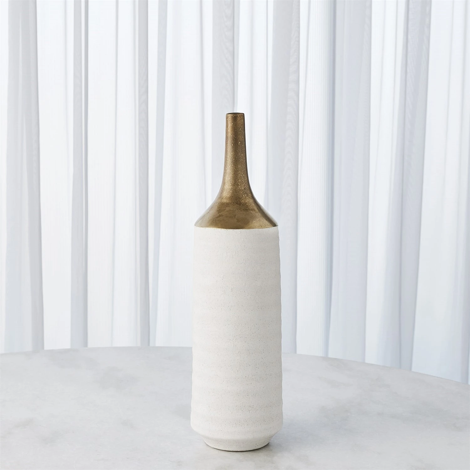 Our Two-Toned Vase is a slip-molded ceramic with a long, antiqued electroplated gold neck. A textured white glaze covers the remainder of the body.